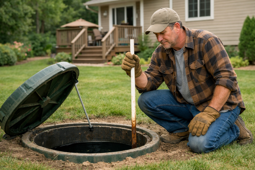 How to check septic system level: Remove the tank access cover, use a measuring stick wrapped in white cloth to check sludge depth at the bottom and scum thickness at the top. When combined layers reach 30% of your tank’s volume (typically 14 inches total), schedule professional pumping. Always wear protective gear and never enter the tank.