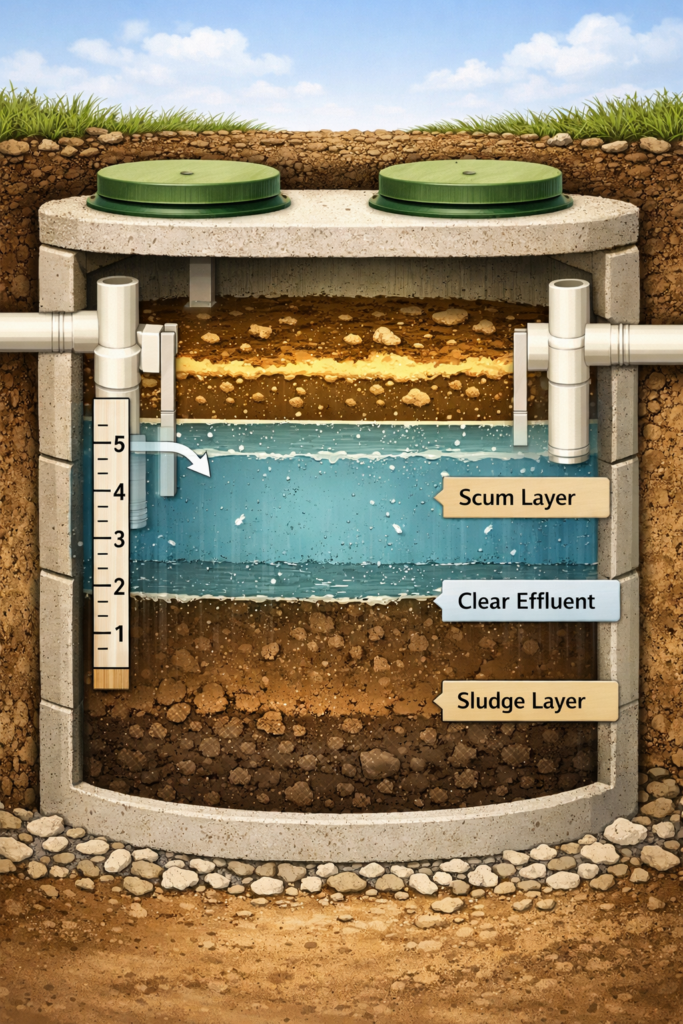 Your septic tank works by separating waste into three layers: scum floats on top, liquid effluent sits in the middle, and sludge settles at the bottom. Over time, sludge and scum accumulate faster than they break down. When these layers get too thick, they push into the effluent zone and can flow into your drain field, causing system failure.