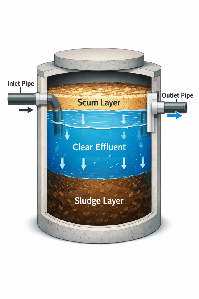 • The tank separates waste into three layers: scum (top), effluent (middle), and sludge (bottom)