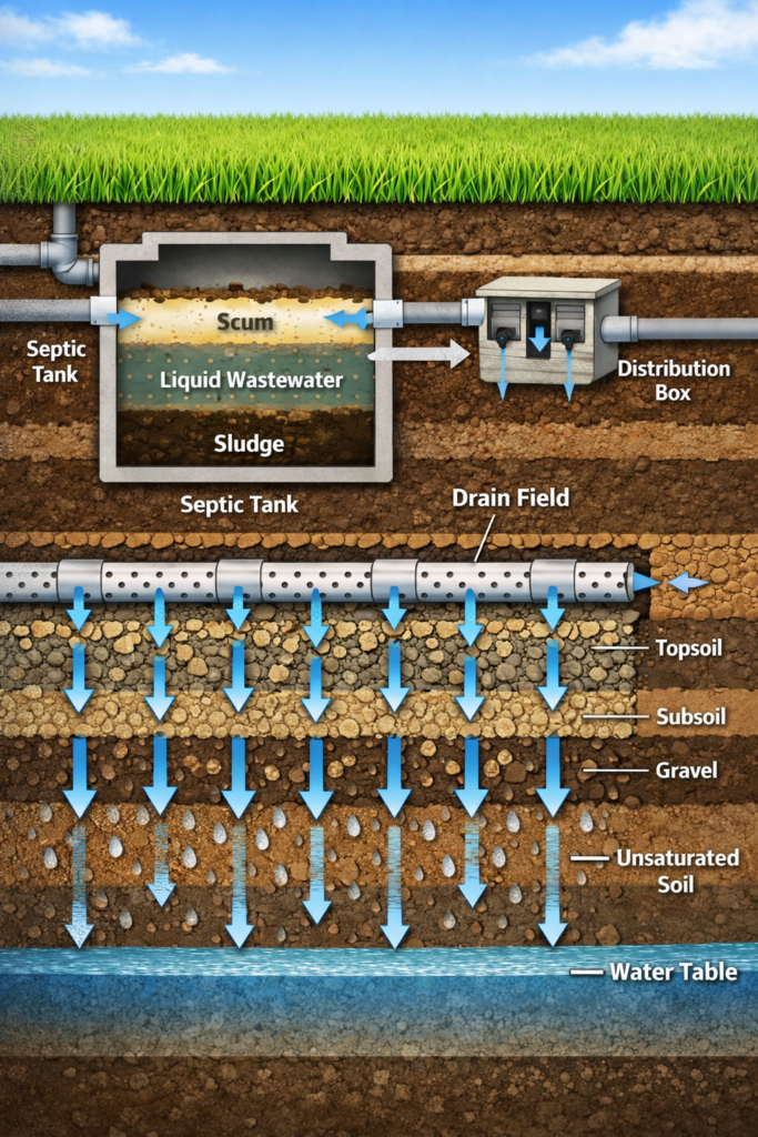 The drain field represents the final and most critical stage of your septic tank wastewater path. Here, soil acts as a natural filter, removing remaining bacteria, viruses, nutrients, and other contaminants before treated water rejoins the groundwater system.